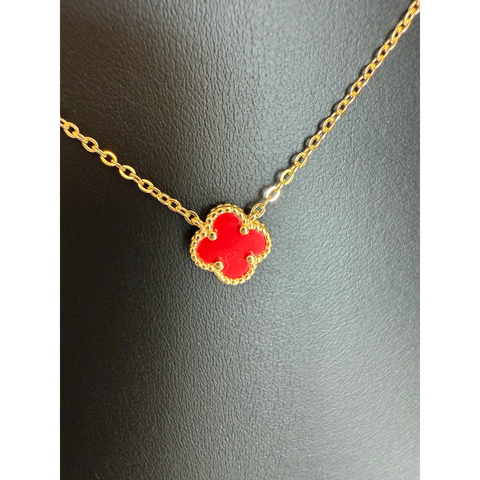 Brand-new clover pendant necklace featuring genuine red carnelian set in 14K gold-plated sterling silver. Adjustable chain 16–18 inches. Clover measures 10 mm. Lightweight and delicate, perfect for everyday wear or gifting. Total weight 2.54 g.