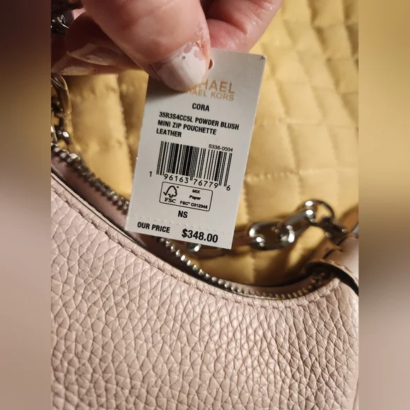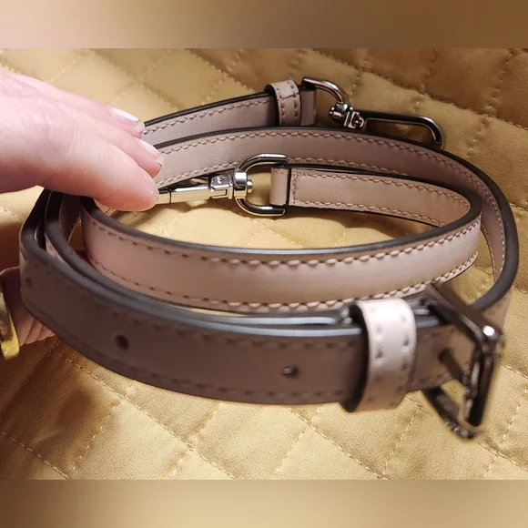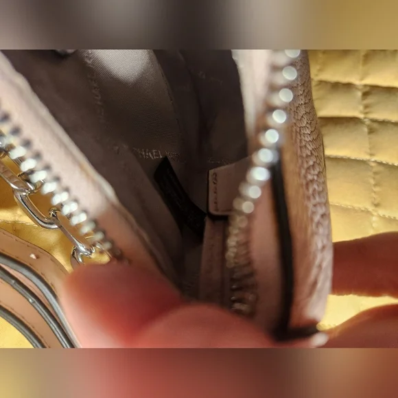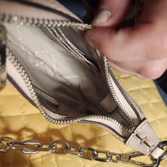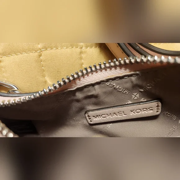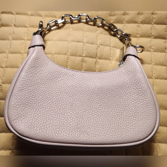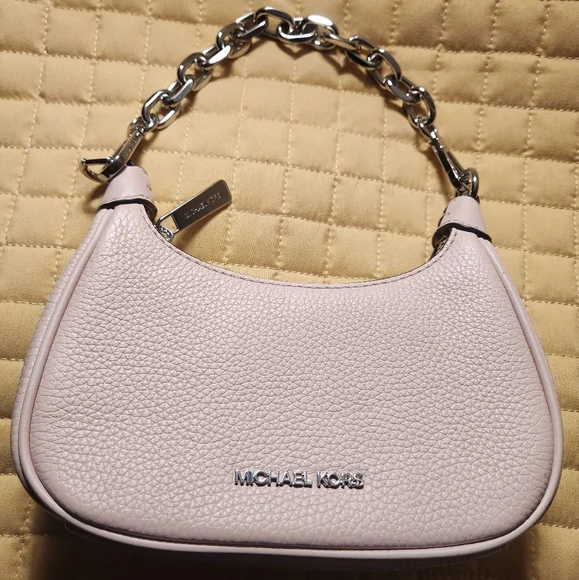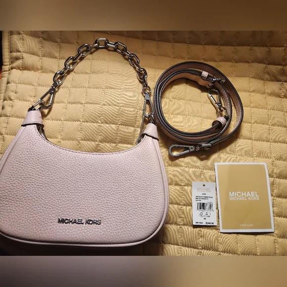 Comes with its authentic adjustable strap and also a removable chain strap., CARE CARD AND PRICE TAG Elevate your style with this elegant pink leather shoulder bag from Michael Kors. Perfect for any occasion, this bag combines luxury and functionality. will fit a regular size phone and more. Adorable blush pink.
