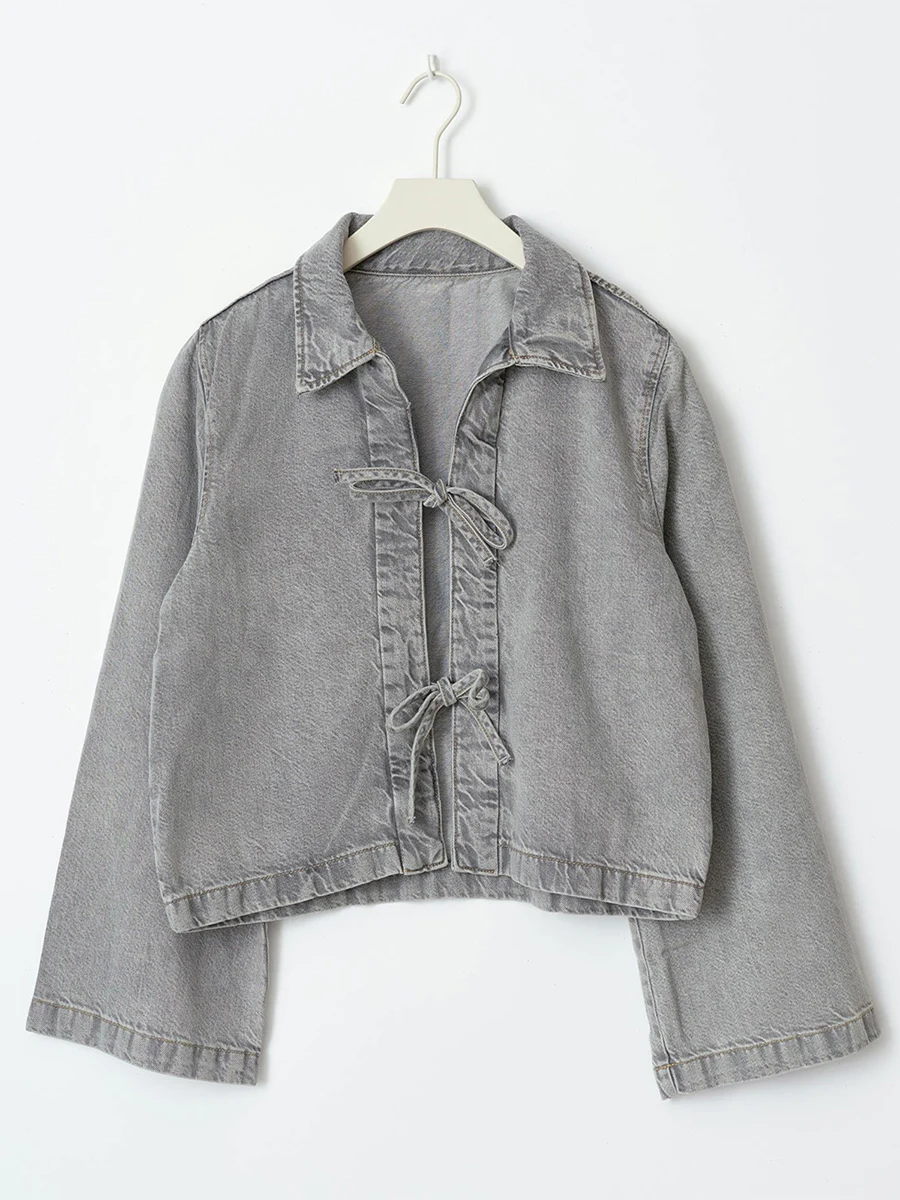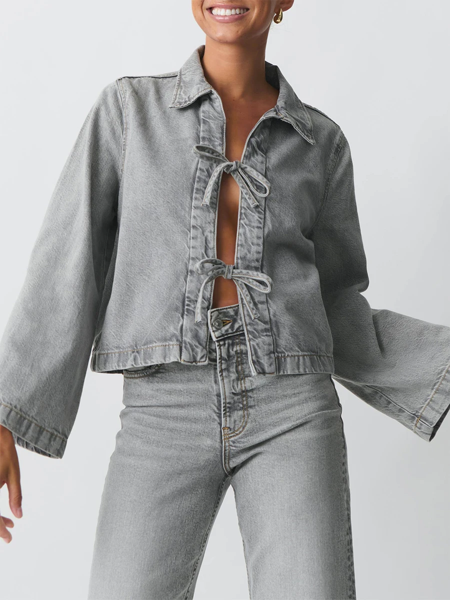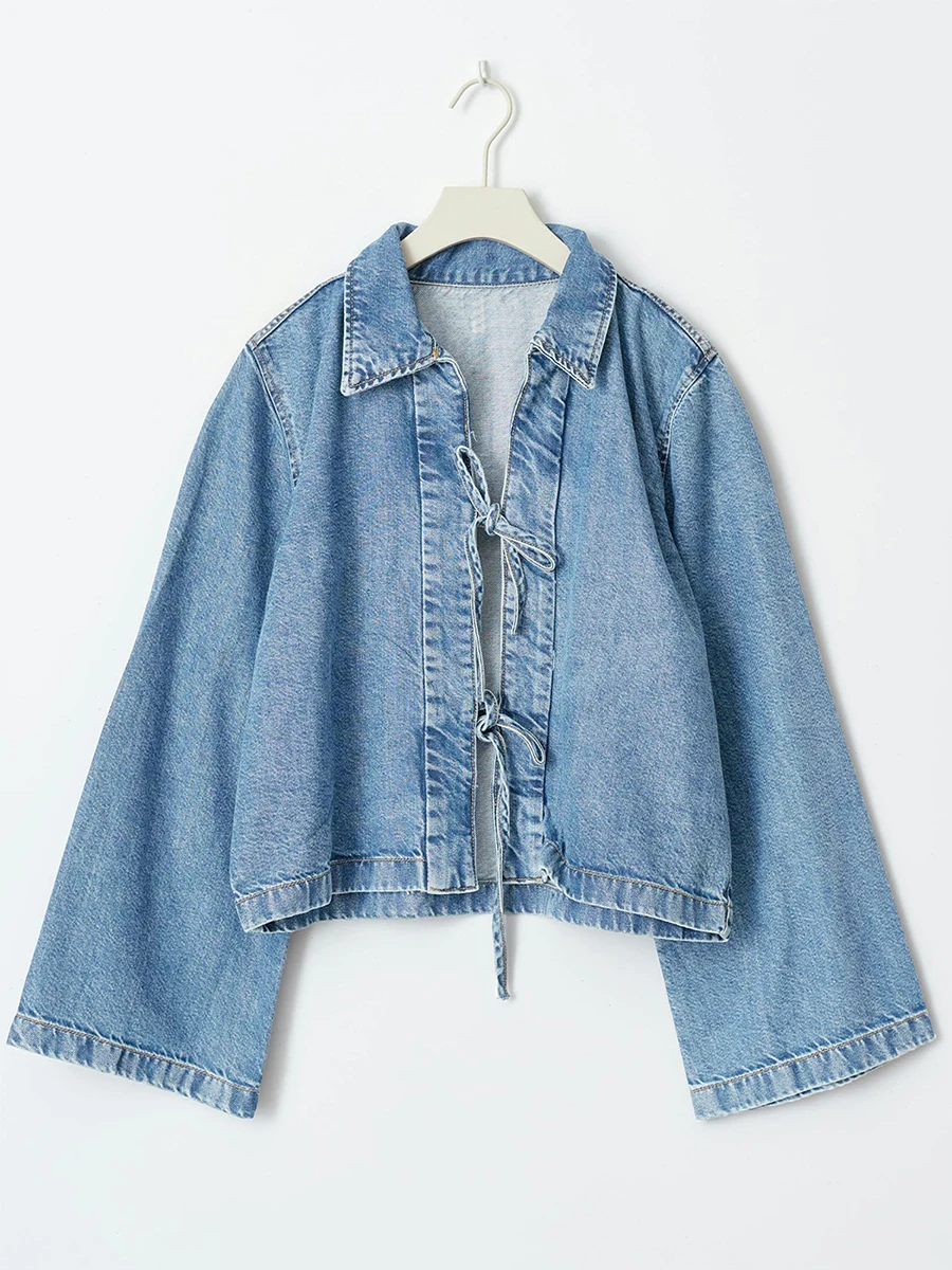 Women's Denim Tie Front Jacket Lapel Neck Solid Color Long Sleeve Casual Crop Fall Coat