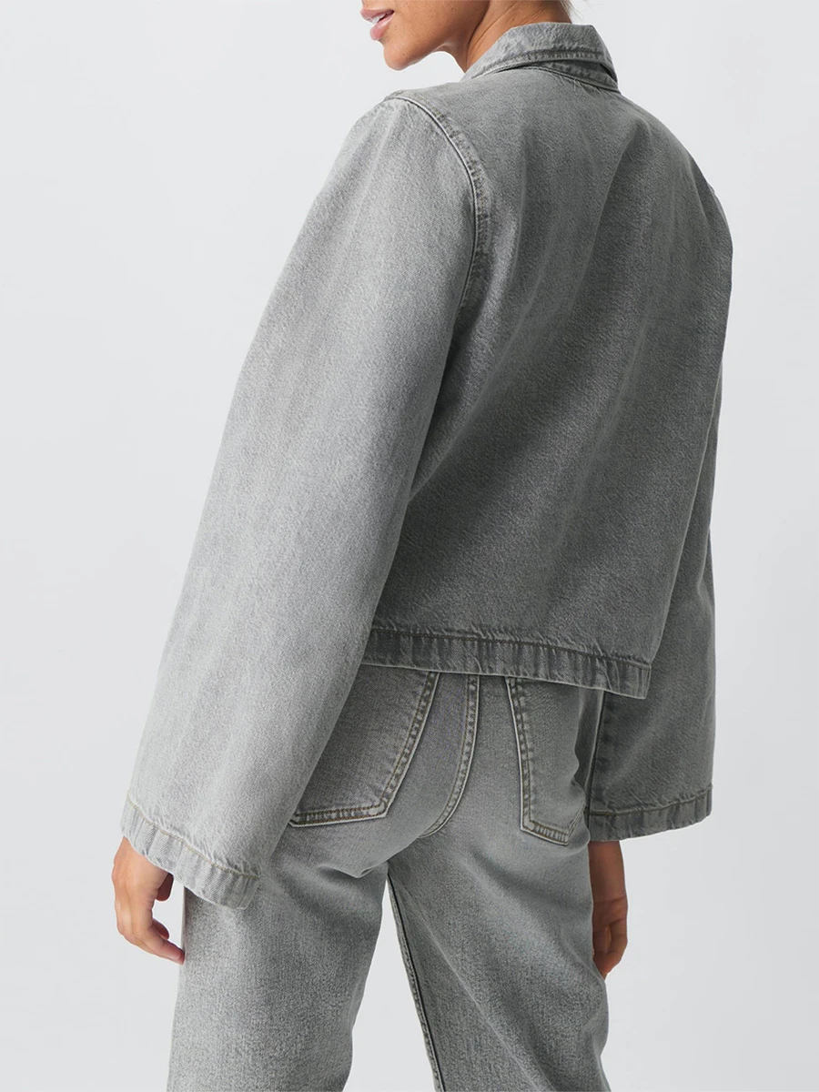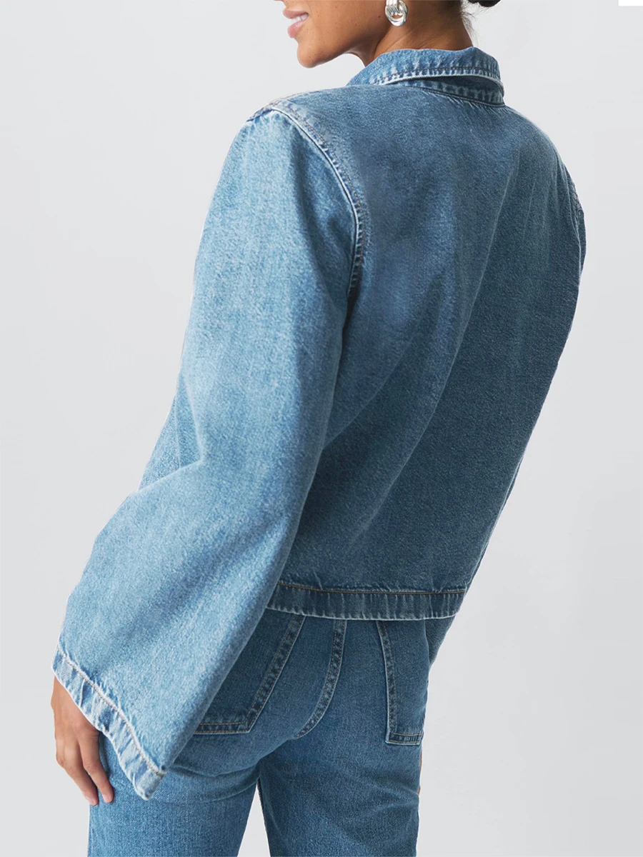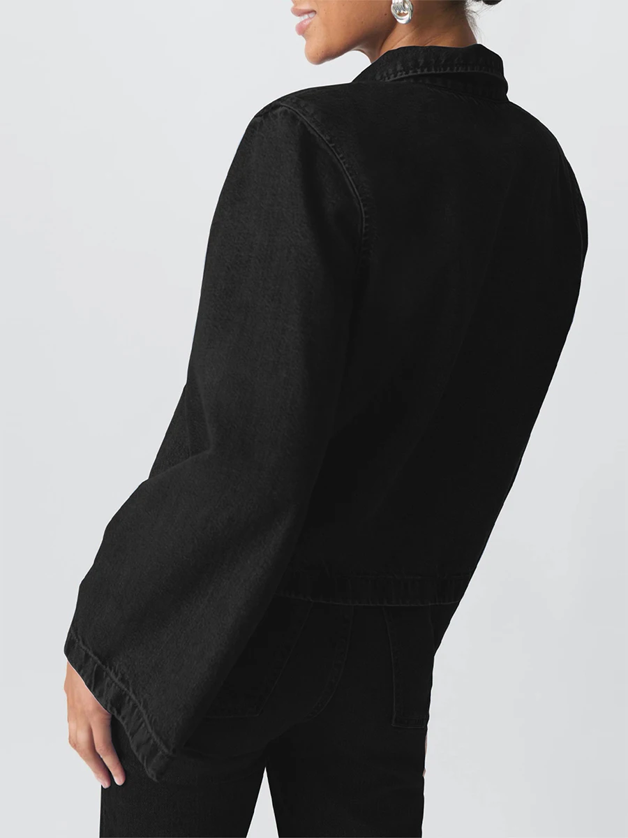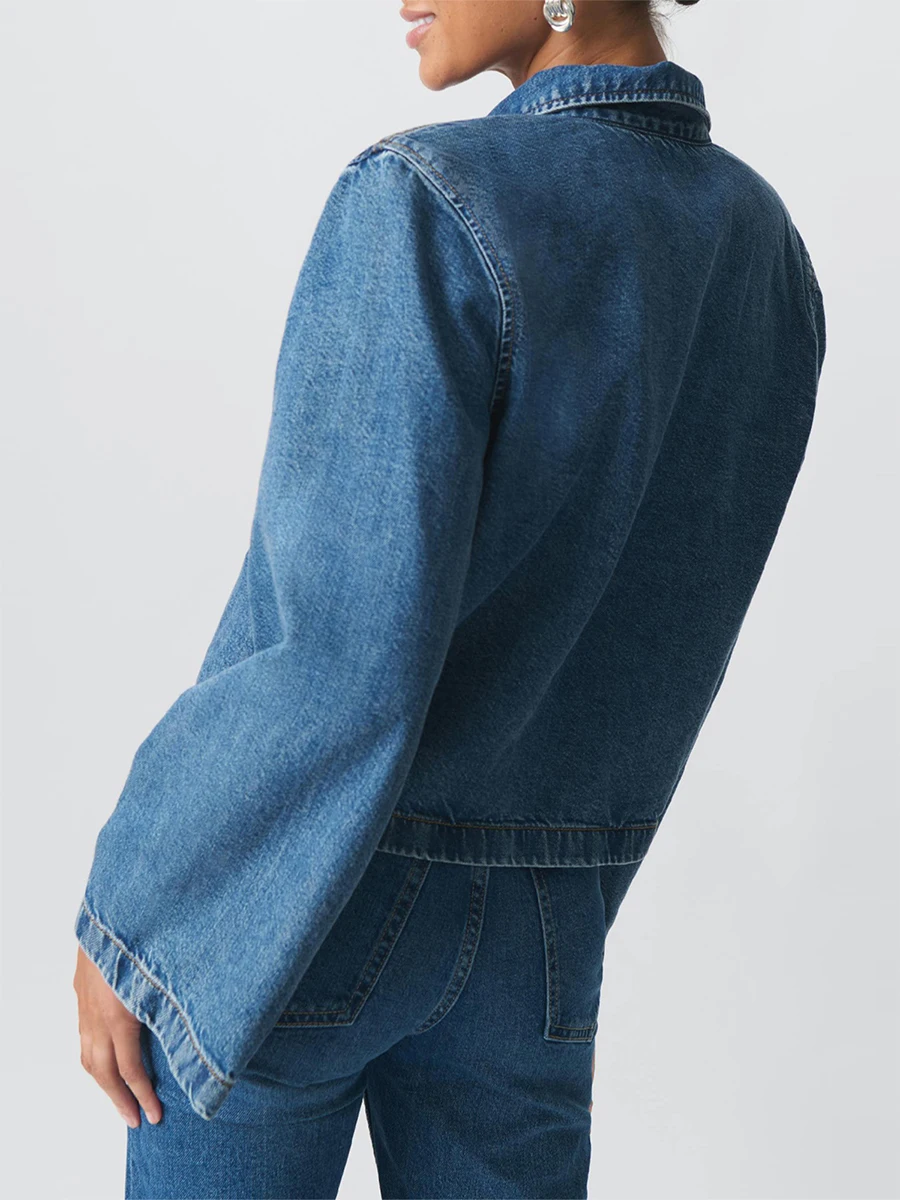 Women's Denim Tie Front Jacket Lapel Neck Solid Color Long Sleeve Casual Crop Fall Coat